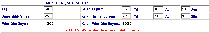 Biraz önce ne zaman emekli olacağıma baktımda bakmaz olaydım :) 60 yaşına kadar çalışmak, kıçımızı kurtarmak şart yoksa. 2042 de emekliyim :)