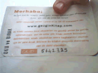 Daha önceleri www.bookcrossing.com‘dan incelediğimiz ve takip ettiğimiz ookcrossing olayı tüm dünyaya yavaş yavaş yayılmaya başlıyo bende blog okurken www.gezginkitap.com un varlığını öğrendim. hemen girdim bi hevesle kayıt oldum etiketleri çıkartıp 1 tane GezginKitap yaptım :) onu Bostanlı – Gümrük arabasının arksına bıraktım. Bırakırken korktum ama birisi bomba koyuyom sanmasın diye gizlice çaktırmadan bıraktım hehe:) elimdeki böyle okuduğum ve tozlu raflara kaldırdığım kitapların hepsini GezginKitap yapıcam :)