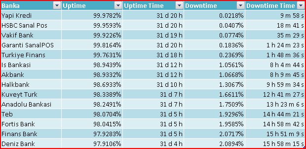 İlk üç bankanın downtime süreleri kabul edilebilir nitelikte olduğunu düşünüyorum. Bir saatin üzerindeki downtime oranları insanı biraz düşündürüyor. Fakat 8 saat ve üzeri kesinti ile hizmet veren bankalardan kesinlikle uzak durulması gerekiyor diye düşünüyorum.